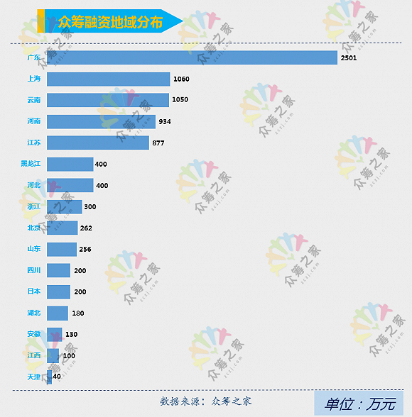 从我们统计的数十家平台来看,众筹行业似乎有从寒冬中回暖的迹象,三月份整个行业融资额环比二月份增长近四倍。我们可以看到,互联网非公开股权融资的地域分布上与VC地域分布格局比较接近,集中于较发达的地区;而收益权类股权众筹项目融资分布则更为分散,下沉更为彻底,广泛地分布于多个地区,甚至包括部分三四线城市。