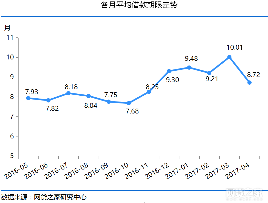 4月网贷行业平均借款期限为8.72个月,环比缩短了1.29个月,同比拉长了1.33个月。本月平均借款期限相对上月缩短。陈晓俊表示,借款期限较短的平台成交量显著增长等多因素影响导致行业借款期限缩短。